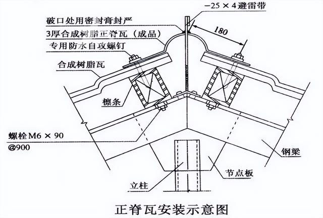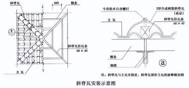 正脊瓦和斜脊瓦分別安裝在屋脊CD線和斜邊上。正脊瓦的安裝要從主瓦區(qū)的一側(cè)開始,確保第一張正脊瓦的搭接處不與主瓦的搭接處重疊,而是相互錯(cuò)開。兩張正脊瓦之間要搭接一個(gè)波形,以確保防水性能。斜脊瓦安裝在多坡屋面的斜邊上,要確保上下對(duì)齊并固定在主瓦的檁條上,兩節(jié)斜脊瓦之間要搭接30mm,最后安裝脊瓦的末端。